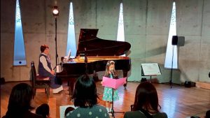 作文を読み、自分のイメージを伝えてから、歌やピアノで演奏しました。担当の美喜子先生が素敵な伴奏をつけて一緒に弾きました。